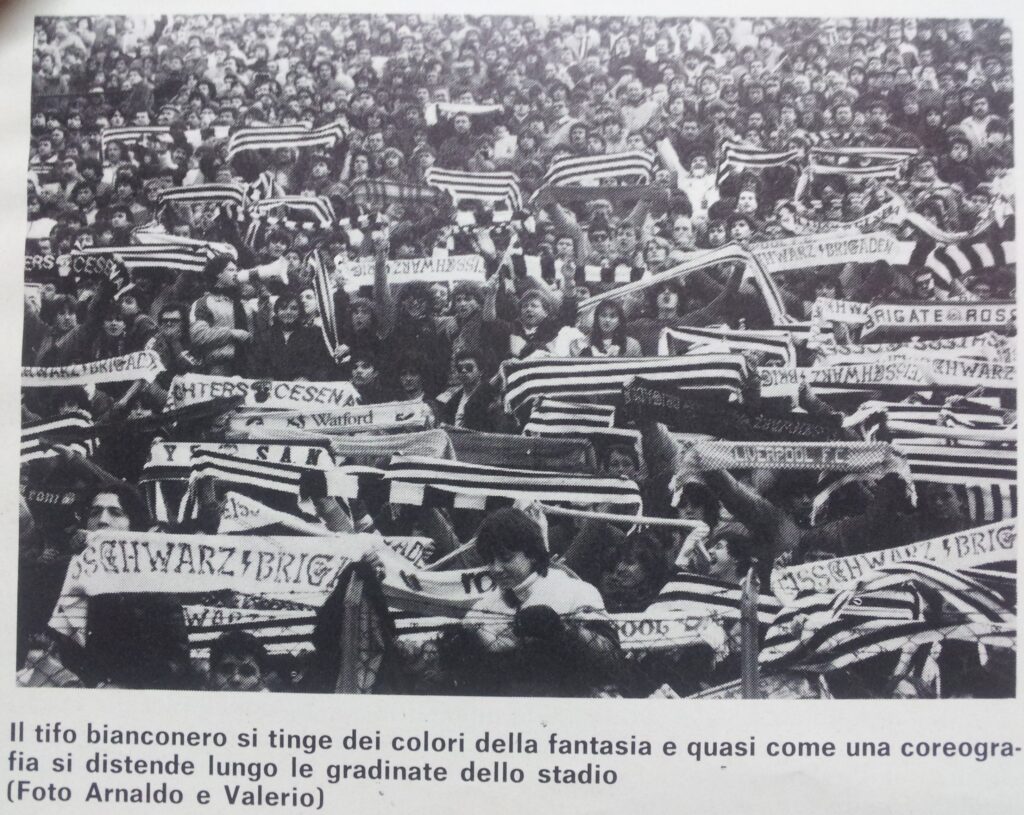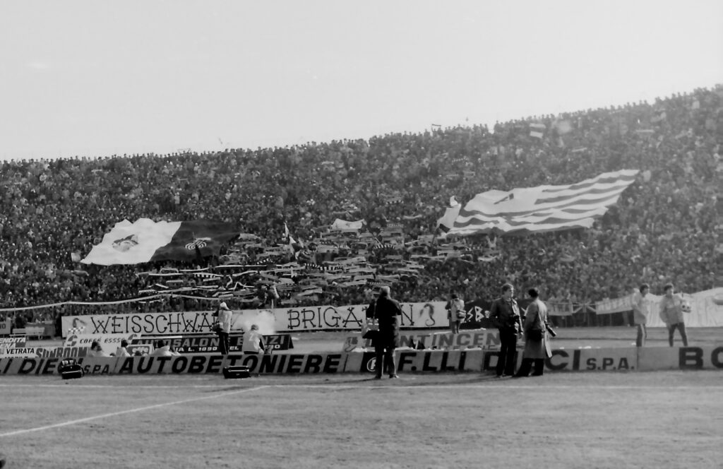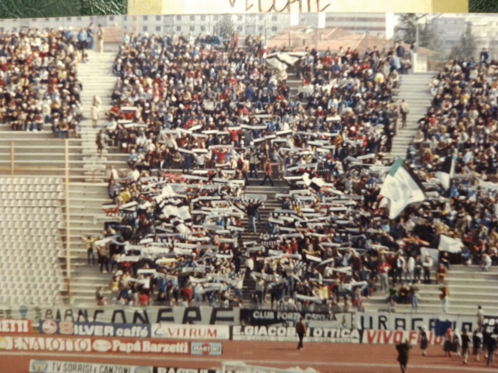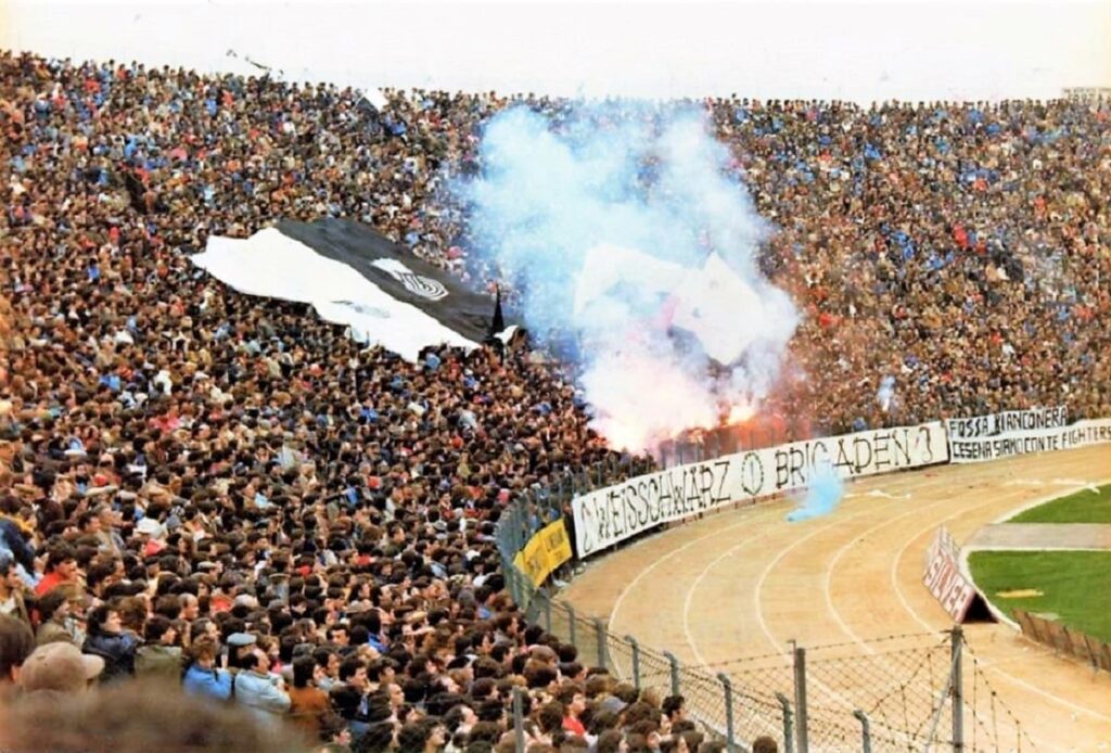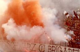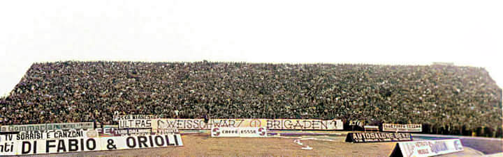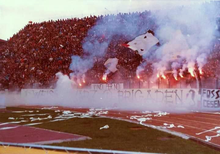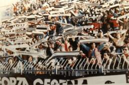 "Quando saremo nella Curva Sud come una bomba il tifo esploderà", si cantava a quei tempi (la foto si riferisce probabilmente a Cesena-Fiorentina) Sciarpe di vario tipo in Cesena-Cagliari Sciarpata in Cesena-Cagliari Fumogeni e torce contro il Cagliari La Curva Sud in Cesena-Cagliari Lo striscione di 42 metri "Meraviglioso Cesena la tua storia è già leggenda" strappato ad Ascoli che poi sarà ricucito Weisschwarz Brigaden (Cesena-Inter) Suggestiva immagine del Curvone e della gradinata contro l'Inter W.S.B. Arrmy in Cesena-Juventus Il Curvone coperto dai fumogeni contro la Juventus La Curva Sud vista dalla Curva Ferrovia (Cesena-Juventus) Cesena-Juventus I draghi sputa fuoco hanno sostituito i teschi con l'elmetto nello strsicione delle Weisschwarz Brigaden (Cesena-Juventus) La Fiorita imbiancata e colorata dai fumogeni in Cesena-Roma Cesena-Roma Weisschwarz Brigaden (Cesena-Torino) Jumbo e dietro il Curvone contro il Torino Cesena-Udinese (da Forza Cesena) Fossa Bianconera (Cesena-Udinese) Il muro del Curvone contro l'Udinese I Tifosi del Centro Coordinamento al Comunale di Torino contro i granata Sciarpata al Friuli di Udine Udinese-Cesena Home Page PrecedenteProssimo