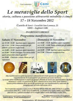 Anghiari (Ar), 18 novembre 2012 – Il Museo Bianconero del Cesena ha partecipato a “Le Meraviglie dello Sport: storia, cultura e passione attraverso mirabilia e cimeli”, una mostra a ingresso libero ospitata nella suggestiva cornice del Castello di Sorci ad Anghiari (Arezzo). L’esposizione, che si è svolta anche il giorno precedente, sabato 17 novembre, ha celebrato la storia e la cultura dello sport in tutte le sue forme.
