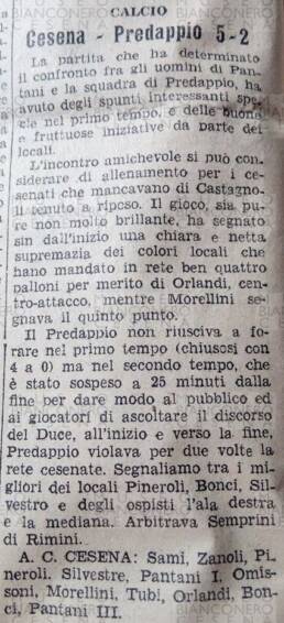 Tornando alla gara amichevole, questa fu importante ai fini della preparazione, ma di fatto si ritenne molto più importante consentire al pubblico presente ed ai giocatori di terminare la partita con 25 minuti di anticipo, in modo da poter ascoltare il discorso di Mussolini, radiotrasmesso in diretta nazionale sul “secondo gruppo” dalla E.I.A.R., la mamma di “mamma Rai”. Quel giorno si fermò il calcio a Cesena e in tutta Italia si ebbe una sorta di adunata popolare.