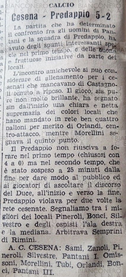 Si giocava un’amichevole proprio quella domenica 23 febbraio, ospite era il Predappio, con i bianconeri che liquidarono i concittadini del Duce col punteggio di 5-2. La parte del leone la fece Mario Vittorio Orlandi, attaccante di Russi, classe 1918, che realizzò quattro reti. In quella stagione Orlandi si rivelò come il primo cannoniere della storia del Cesena, con nove reti al termine della fase regolare a pari merito con Tonino Pantani, ma segnando senza l’ausilio dei rigori e giocando appena dieci partite, cui seguirono altre due reti nelle sei partite del girone finale.